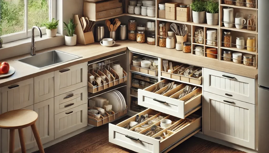 Dolap içi raf yükselticileri ve çekmece bölücüleri, dolapları daha düzenli ve işlevsel hale getirir.